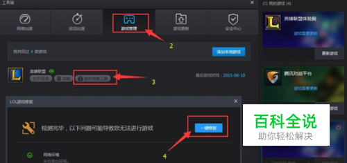解决方案1: 发生这种情况有可能是IE缓存问题,数据异常(采用第三方插件导致)或网络延迟问题,可以彻底清理缓存,建议使用英雄联盟助手工具箱内的LOL游戏修复工具进行修复,并且使用英雄联盟助手(才可以开启该助手的加速器)登录游戏。英雄联盟助手可到官网下载。