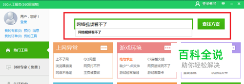 第二步进去人工服务界面之后,在搜索框中输入“网络视频看不了”,点击查找方案,如下图所示: