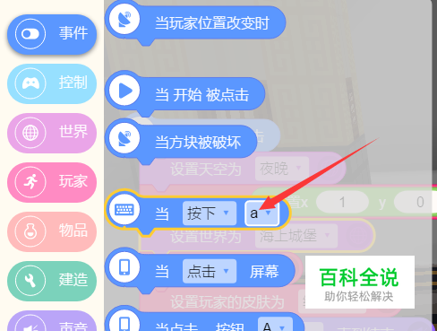再选中建造选项,选择建造中的在焦点上放置方块。拖动到编码位置。可以就将内部的定义方块拖出来,到最左侧的回收站删除,选择物品中的字母方块来代替原来默认的方块。