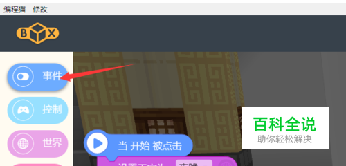 打开编程猫界面,首先我们可以选择主界面上的事件选项,选择事件中的当按下A按钮,如图所示,选中之后积木模块就出现在编程界面上,选中之后按住鼠标左键拖到相应的位置。