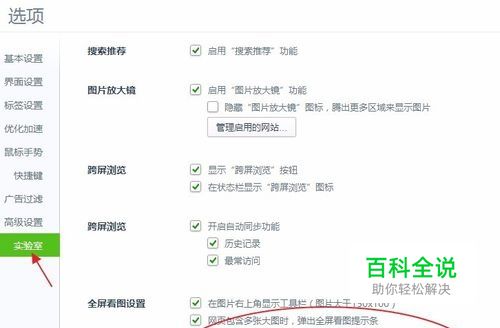 打开设置后,点击“实验室”。按自己需要,勾选:“网页包含多张大图时,弹出全屏看图提示条”和“网页包含多张大图时,显示地址栏提示按钮”,然后设置下面“图片尺寸大于...像素”这里,最小的像素是150*100,你填大于这两个数字即可,当图片尺寸大于这个值时,网址栏下面就会显示保存图片提示条和相关按钮。也可以勾选下面的“快速保存图片时不询问保存位置”选择自己喜欢的文件夹位置。