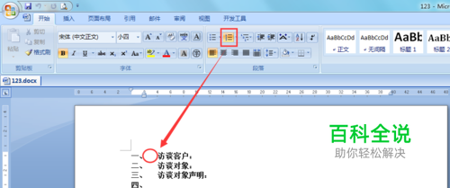 如图所示,当我们使用word的编号功能时,有时候会发现编号与文字间的间隔过大(圆圈所示处),而且不能通过拉扯标尺进行调整