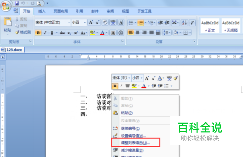 这时候我们可以通过“调整列表缩进”进行调整,具体操作如下 1.选择你需要调整的段落,即将光标移到要调整的段落处,右键点击。选择“调整列表缩进”