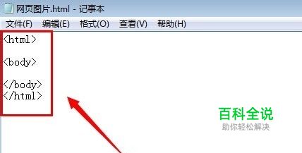 打开记事本后,输入代码<html></html>和<body></body>网页基本结构标签。