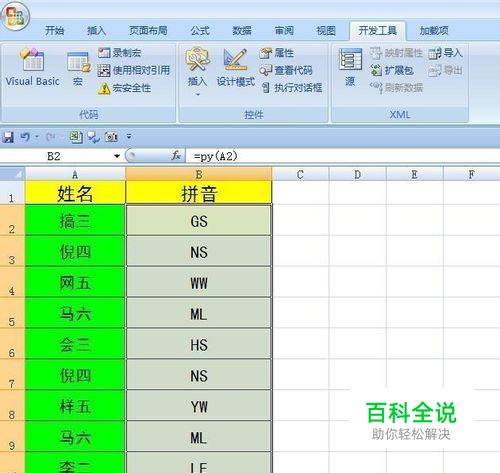 现在转到工作表中,我们在B2中输入=PY(A2),回车我们就看到姓名的拼音首字母显示出来了。