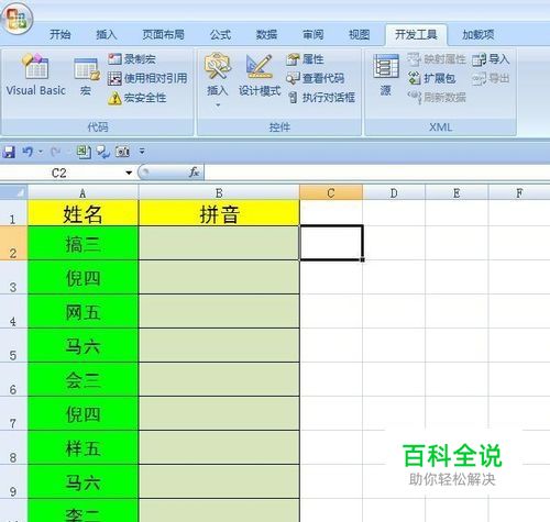导入一张含有姓名的表格,把姓名放到A列中,在B列中将要导出拼音。
