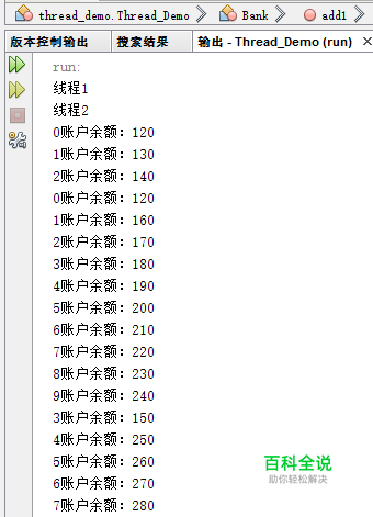 线程的同步对电脑的开销是很大的,我们应该尽量避免同步的使用,或者说能缩小同步的范围就尽量减少,能同步代码块的就不要去同步整个方法。 下面附上线程同步的运用: package thread_demo; /** * * @author Admin */ public class Thread_Demo { class Bank { private int account = 100; public int getAccount() { return account; } /** * 同步方法实现 * @param money */ public synchronized void add(int money) { account += money; } /** * 同步代码块实现 * @param money */ public void add1(int money) { synchronized (this) { account += money; } } } class CreateThread implements Runnable { private Bank bank; public CreateThread(Bank bank) { this.bank = bank; } @Override public void run() { for (int i = 0; i < 10; i++) { bank.add(10); System.out.println(i + "账户余额:" + bank.getAccount()); } } } /** * 建立线程,调用内部类 */ public void exeThread() { Bank bank = new Bank(); CreateThread new_thread = new CreateThread(bank); System.out.println("线程1"); Thread thread1 = new Thread(new_thread); thread1.start(); System.out.println("线程2"); Thread thread2 = new Thread(new_thread); thread2.start(); } public static void main(String[] args) { Thread_Demo td = new Thread_Demo(); td.exeThread(); } } 如图: 1:为加synchronized关键词的结果,即同步得到的结果 2:为不加synchronized关键词的结果,即不同步得到的结果