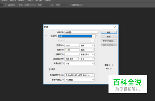 之后我们打开ps软件,然后新建一个画板,也可以使用Ctrl键+n,新建一个画板宽度和高度以实际图片来对照,如下图所示。