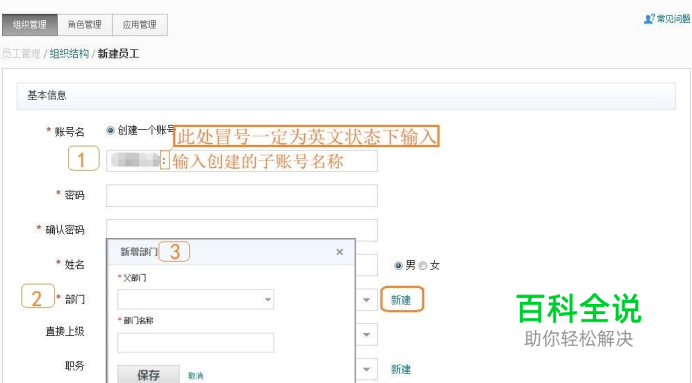 点击“新建员工”创建子账号、新建部门。