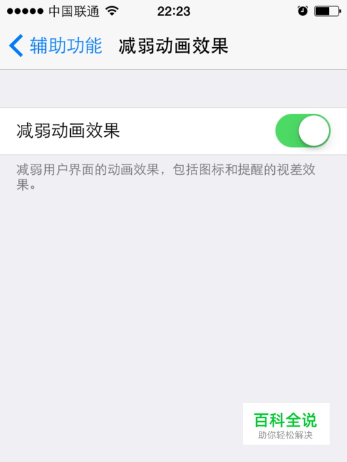 【减弱动画效果】的选项按钮取消了之后,就完成了全部的设置了。这样就取消了iPhone苹果手机的动画动作效果
