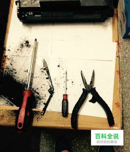 首先我们先准备好工具,硒鼓一个,螺丝刀、钳子、刀片、锥子