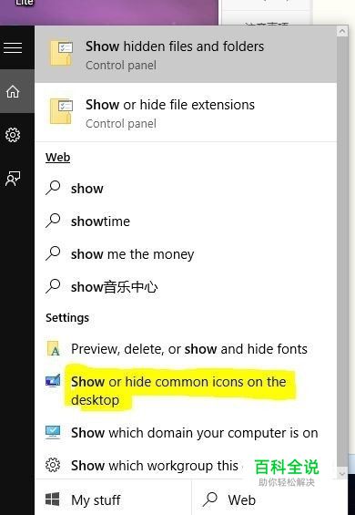 找到'show or hiden common icons on desktop', 并打开找到选项窗口