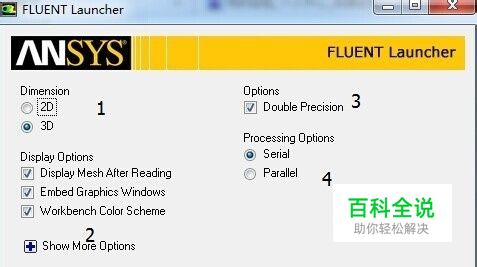 打开页面中,1处表示的是处理2D还是3D,2处是一些选项,可以选择默认选项;3处表示可以选择双精度;4处可以选择单核还是多核处理。选择完毕后,点击“OK”