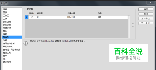 功能的设置方法 打开PS,进入首选项-暂存盘,在这里你可以设置PS缓存文件的存放位置,在你电脑中哪个盘符空间最大就选哪个。 我只有一个盘,所以可选的存放位置也只有一个。
