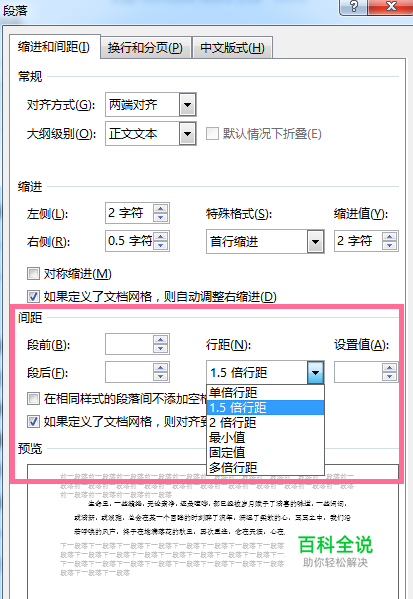 在弹出的段落编辑器里,找到间距中的【行距】,在行距下拉中,有以下选项:有倍数行距、最小值、固定值三类,可以根据需要进行选择。这里我们选择1.5倍行距。