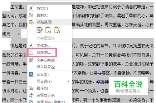 打开文档,选中要设置的文字(如整篇则可以全选,或快捷键Ctrl+A)鼠标单击右健,在弹出的界面中选【段落】如下图