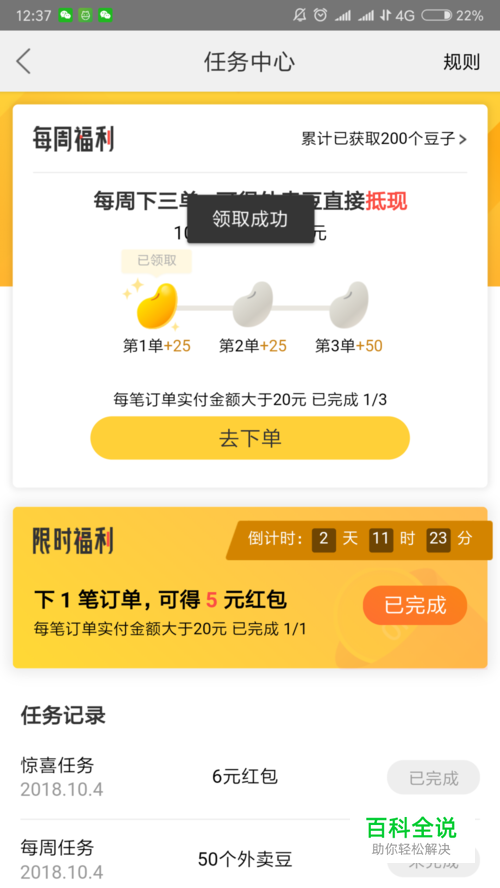 点击【领取任务】后,可以看到会提示你任务领取成功,按钮变成了【去下单】。