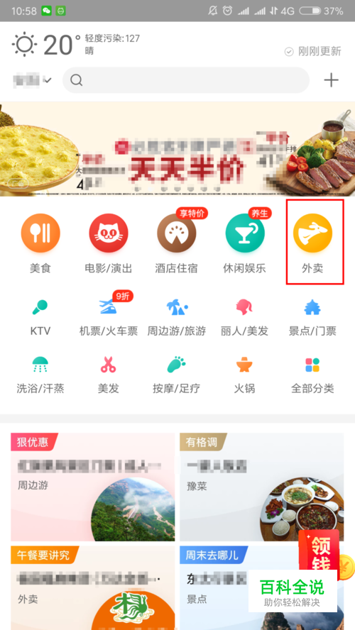 然后回到外卖专题页中,在顶部点击【美食】,去查找你想吃的外卖。如果不会订外卖,可以查看下面引用的经验