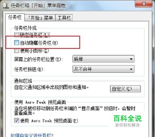 第二步进去任务栏属性之后,将“自动隐藏任务栏”的勾选去掉,如下图所示: