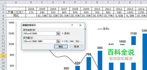 这时,又会弹出一个“编辑数据系列”的窗口,点击图示位置的图形,然后选中含有图例所代表文字的单元格。
