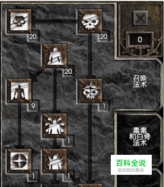 技能点的分配 ①主攻技能 骷髅复苏加满,骷髅支配加满,尸体爆炸加满,伤害加深加1点。 ②辅助技能 进攻类:支配石魔加1点,黏土石魔加满,衰老诅咒加1点,复活怪物加1点。 防御类:微暗灵视诅咒加1点,迷乱诅咒加1点,召唤反抗加1点。 ③路过技能 上次总论里面说过,路过技能意思是没有用的技能,但作为上述某些技能的前置技能,都要加1点才能实现上述分配。 复苏骷髅法师加1点,鲜血石魔加1点,钢铁石魔加1点,牙加1点,削弱诅咒加1点,恐惧诅咒加1点。 说明:1.诅咒可以根据个人喜好,只有伤害加深和衰老最重要,其他没有也不太要紧,但为了安全最好有微暗灵视和迷乱。 2.上面的加点针对粘土石魔的情况,如果要用钢铁石魔,应改为石魔支配加满,钢铁石魔加1点。 3.有人愿意加白骨装甲提升安全性,我觉得意义不是很大,这个可以根据个人喜好,如果想加白骨装甲,最好在最后技能点富余的时候加。