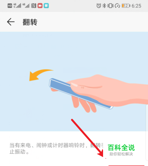在翻转静音设置界面,可以看到使用该功能的具体示意图,同时可以看到来电静音这个选项。