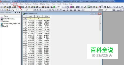 激活如图所示的worksheet为三维散点图的初始数据,选中XYZ数据执行Plot-3D Symbol/Bar/Vector-3D Scatter。