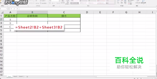 第二步:在单元格B2中输入公式=Sheet2!B2+Sheet3!B2,用同样的方法计算BCD的总销售额