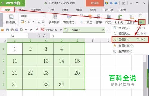 点击“ 开始”标签——点击“ 查找”图标——“ 定位”,快捷键: Ctrl+G