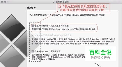 插入U盘选中第二个复选框,下载最新的Windows支持软件到U盘中,方便Windows安装成功之后安装全部驱动。