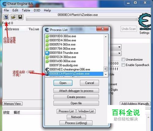 首先,打开CE修改器,打开进程。这里以PVZ(植物大战僵尸)为例。