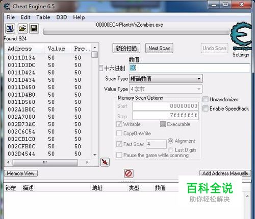 进入游戏。我们首先来尝试修改阳光数量 首先搜索 目前阳光数量(50)。