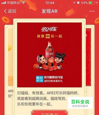 打开手机进入支付宝五福扫一扫活动界面或者复制以下口令到达界面:#吱口令#长按复制此条消息,打开支付宝即可发现的新世界RbYo3000Z3sg使用支付宝AR扫一扫,扫可乐、雪碧、果粒橙瓶身图像,赢惊喜,和全家人分享。