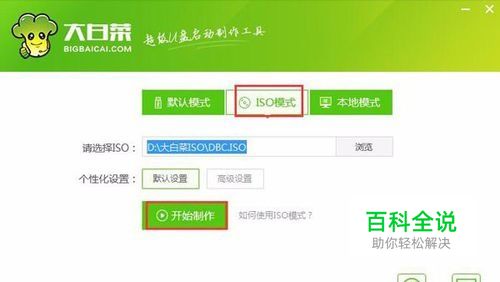 到大白菜官网下载并安装好大白菜u盘制作工具,然后打开,选择“ISO模式”,点击“开始制作”。