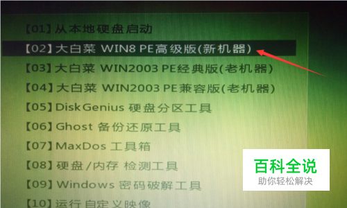 安装完后,进行计算机U盘启动(根据自己的电脑型号),如图,我们选择“大白菜WIN8PE高级版(新机器)”。