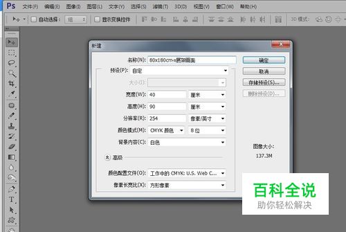 以设计一个80x180cm的展架画面为例:我们可以新建一个画布大小为40x90cm、分辨率为254dpi的文件进行设计制作。具体设置数值为:尺寸40x90厘米,分辨率为:254像素/ 英寸,色彩模式为:cmyk,8位。