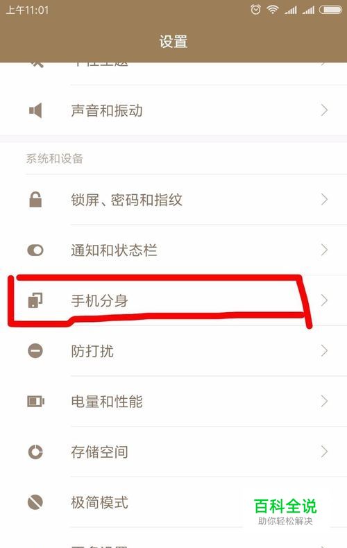 先找到手机的“设置”,往下拉到系统和设备“手机分身”,点进去就看到图2,再点底下的开启手机分身,然后系统就会自动帮你生成分身。