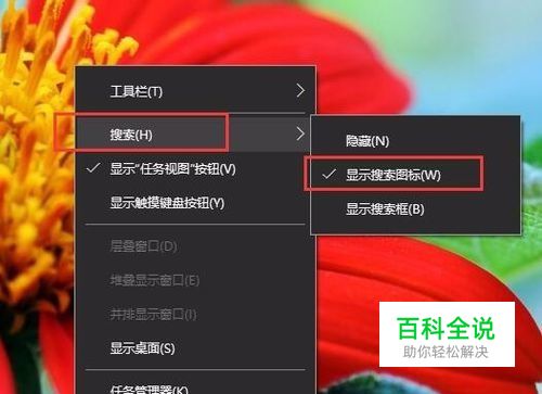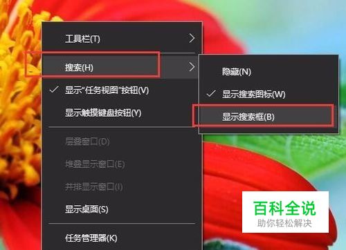 接下来,我们可以看到该设置中关闭了微软小娜的搜索框显示,这里我们点击选择“ 搜索-显示搜索框”选项即可。