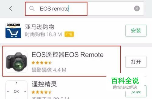 打开红米手机,点击“应用商店”,在搜索栏中输入“EOS remote”,之后安装“EOS遥控器EOS Remote”,如图所示