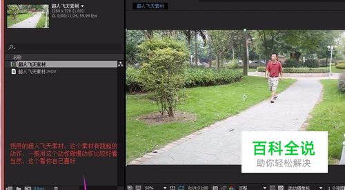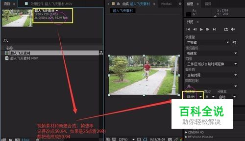 1:我用超人飞天的素材来制作慢动作,因为那个跳起的动作正好可以拿来做慢动作,效果可以比较明显。2:如图2,视频素材和新建合成,帧速率要59.940,不够的,改为59.40 3:选择视频素材,在第一帧,选择图层---时间----启用时间重映射