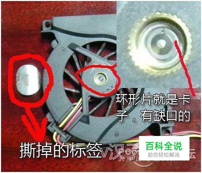 第二种:稍微复杂,需要将风扇翻过来,撕掉标签,用镊子一类尖状物体挑开卡子,然后扇叶直接可以拿下来,同时也可以把滚珠轴承拿下来清洗,方法如下图所示,例如ASUSA6A8系列中大部分机器等等...... 安装方法:相反顺序装回轴承,插上扇叶,把卡子按下去,卡住扇叶中心轴。 注意事项:这种风扇尽量少拆,或者已经快坏的可以考虑拆解一下。