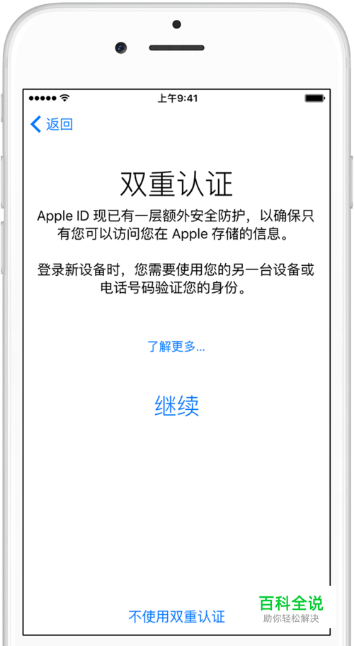 在新设备上设置 如果您正在设置新设备和双重认证,并且满足所有建议的系统要求,则在使用设置助理过程中,登录后您可能会看到以下屏幕。 要继续操作,请轻点“继续”并输入可在登录新设备时用于接收验证码的电话号码。验证此电话号码后,双重认证将会自动开启。