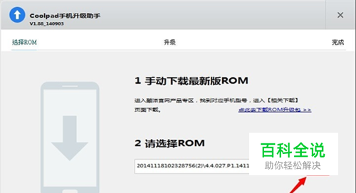 将下载好的酷派大神F2联通版(8675-W00)在电脑上进行解压,得到【4.4.027.P1.141104.8675_W00.CPB】,然后再酷派手机升级工具界面上,点击【浏览】,然后找到刚才的线刷包,如下图