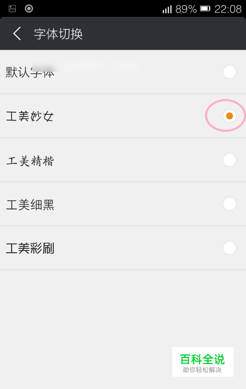 第二步:.在字体切换界面,可以点击自己喜欢的字体,下面以“工美妙女”为例,选择后点击确定即可。