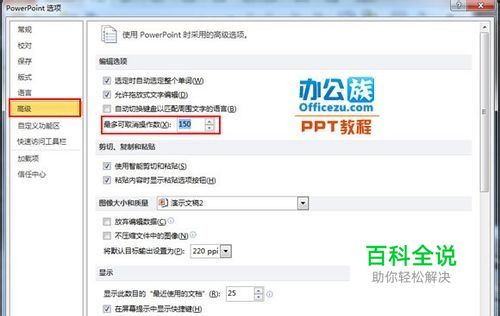 在弹出的PowerPoint选项中点击“高级”工具栏,在“最多可取消操作数”一栏中选择自己需要设置的取消操作数。按“确认”键即可。