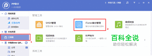 打开“PP助手”软件,再依次点击“工具箱”,“iTunes备份管理”。