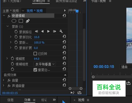 鼠标移到效果控件这里,点击“快速模糊”这里的矩形蒙版工具。创建一个矩形蒙版。