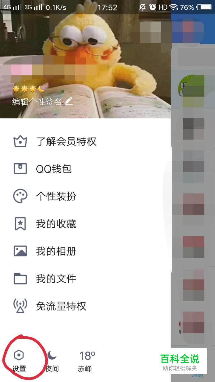 在手机中找到自己的QQ,进入QQ后,向左滑,找到下方的“设置”,点击设置。