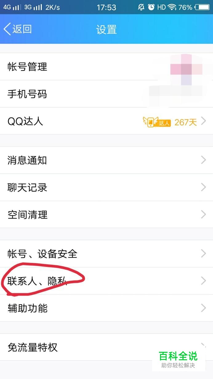 进入到设置界面后,找到“联系人、隐私”这个选项,点击,进入到下一界面。