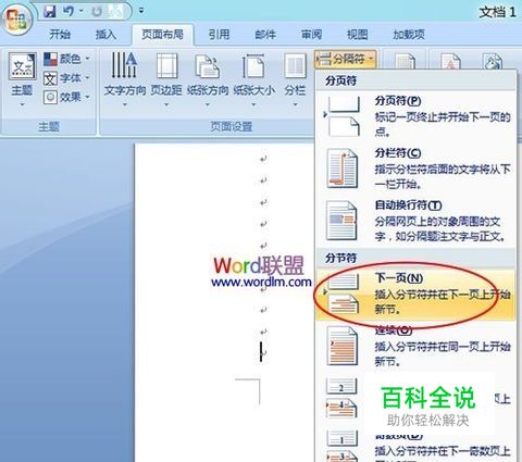将鼠标定位到每一页的页尾处,然后单击进入“页面布局”选项卡,在“页面设置”选项组中单击“分隔符”选择“下一页”;